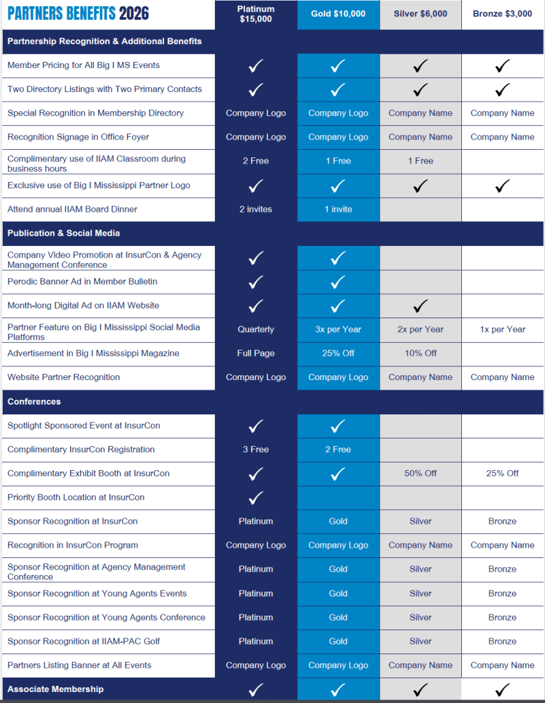 Select from four partnership levels designed to fit your goals and budget. Each level combines event visibility, digital promotion, and year-round recognition to keep your company in front of Big I Mississippi members.